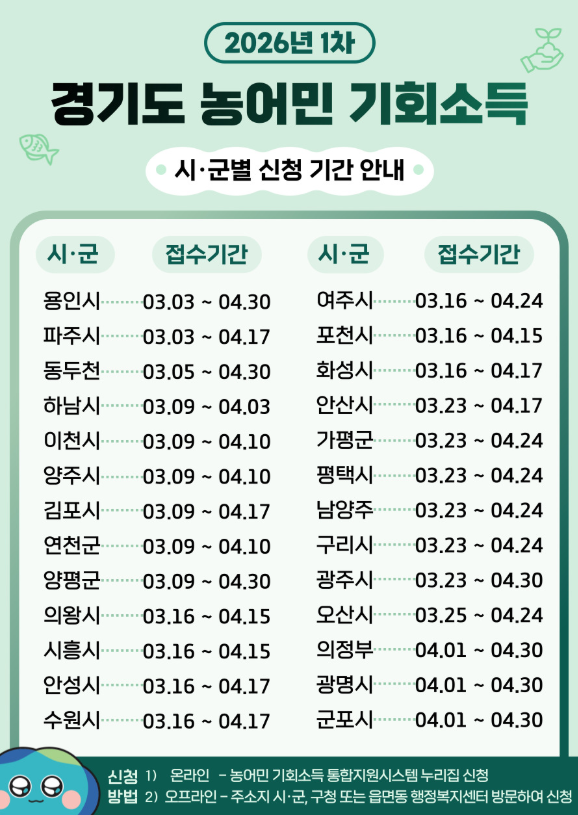 - 해당 시군 연속1년(또는 경기도내 비연속 2년)이상 거주 및 연속1년(또는 경기도내 연속 2년)이상 영농영어, 농외소득 3,700만원 미만 인 자