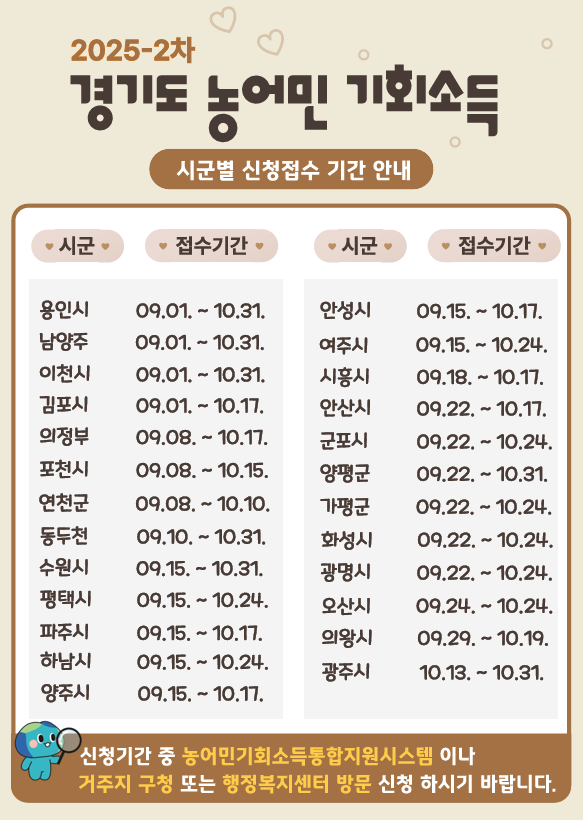 - 해당 시군 연속1년(또는 경기도내 비연속 2년)이상 거주 및 연속1년(또는 경기도내 연속 2년)이상 영농영어, 농외소득 3,700만원 미만 인 자